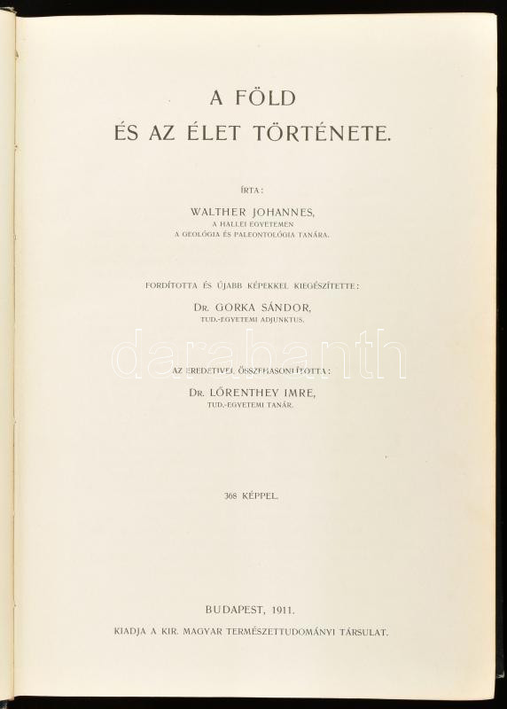 Walther Johannes: A föld és az élet története. Ford. és újabb képekkel kiegészÃtette: Dr. Gorka Sándor. Bp., 1911., Kir. Magyar Természettudományi Társulat,("Pátria"-ny.) ElsÅ‘ kiadás. Gazdag fekete-fehér képanyaggal illusztrált. Kiadói egészvászon-kötés, Gottermayer-kötés, kissé kopott borÃtóval, benne újságcikkel.