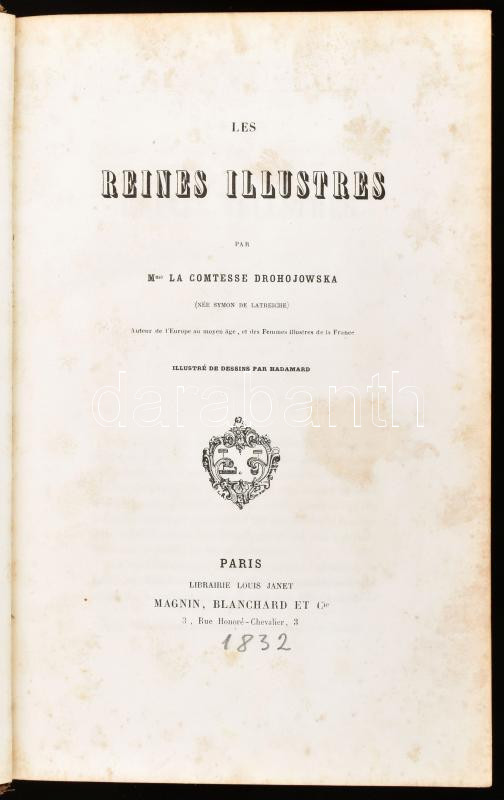 Paris, [1832] Librair... https://www.darabanth.com/en/457-Online-auction/457.0/Books/Books-Other-languages~1500033/Drohojowska-La-Comtesse-Les-Reines-Illustres-Paris-1832-Librairie-Louis-Janet-Magnin-Blanch~II3054388