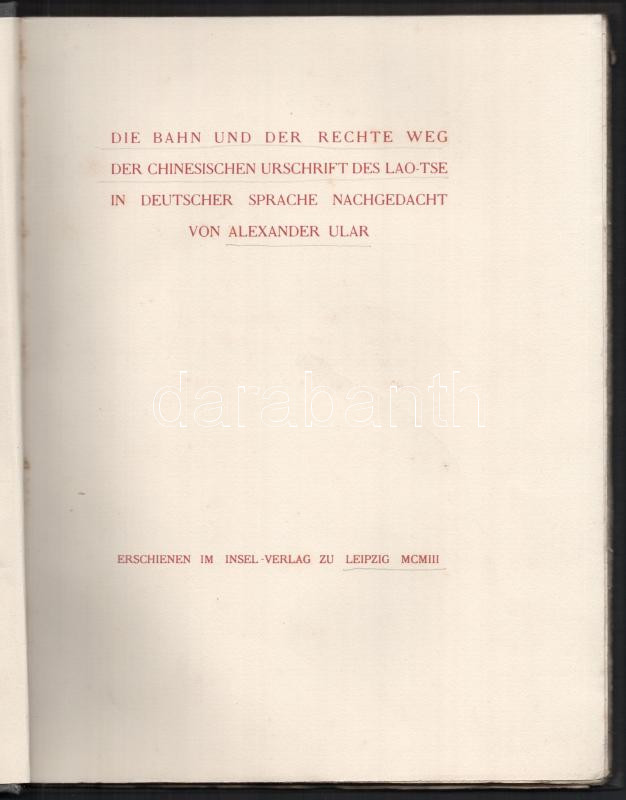 Ular, Alexander: Die Bahn und der rechte Weg des Lao-Tse. Der chinesis... https://www.darabanth.com/en/457-Online-auction/457.0/Books/Books-Other-languages~1500033/Ular-Alexander-Die-Bahn-und-der-rechte-Weg-des-Lao-Tse-Der-chinesischen-Urschrift-des-Lao-Tse-in-~II3055615