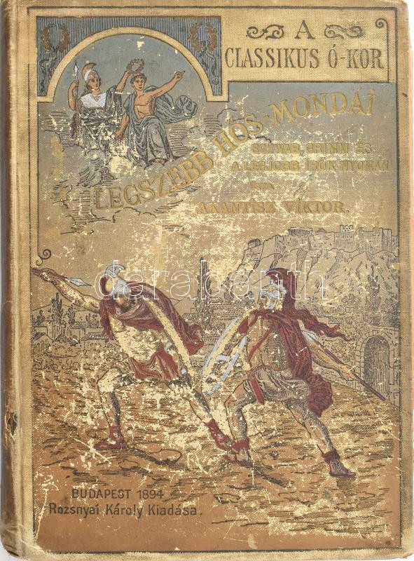 Akantisz Viktor: A klassikus ókor legszebb hősmondái Schwab, Stoll és mások nyomán a művelt közönség számára. Átdolgozta: - -. Bp.,én.,Rozsnyai Károly. Egészoldalas illusztrációkkal. Kiadói illusztrált egészvászon-kötés, kopott borítóval, laza, sérült kötéssel, kijáró lapokkal, kissé foltos lapokkal, megviselt állapotban.