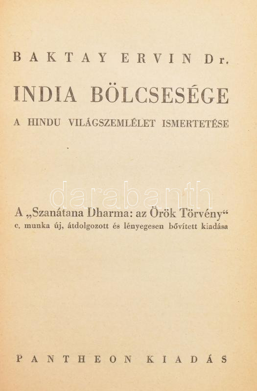 Baktay Ervin: India bölcsessége. A hindu világszemlélet ismertetése. A ,,Szanátana Dharma: az Örök Törvény" c. munka új, átdolgozott és lényegesen bővített kiadása. Bp., 1943, Pantheon, 256 p.+ 1 (kihajtható) t. Első kiadás. Átkötött félvászon-kötésben, az előzéklapon apró lapszéli szakadással, egyébként jó állapotban.
