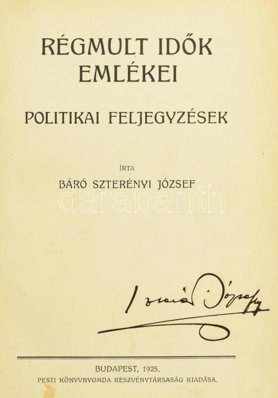 Báró Szterényi József: Régmúlt idők emlékei. Politikai feljegyzések. A szerző, Szterényi József (1861-1941) politikus, kereskedelemügyi miniszter, iparfejlesztési és iparoktatási szakértő által ALÁÍRT példány. Bp.,1925., Pesti Könyvnyomda Rt., 261+1 p. Egyetlen kiadás. Kiadói kopott egészvászon-kötés, az elülső szennylap kijár, a hátsó szennylap szakadt.