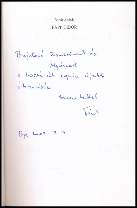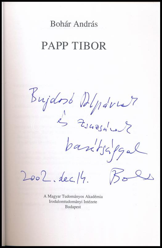 Bohár András: Papp Tibor. Kortársaink. Bp.,2002,MTA Irodalomtudományi Intézete. Kiadói papírkötés. A szerző, Bohár András (1961-2006) képzőművész, író és Papp Tibor (1938-2018) József Attila-díjas író, költő, műfordító, szerkesztő által Bujdosó Alpár (1935-2021) költő, mérnök, a Magyar Műhely szerkesztője a magyar avantgarde kiemelkedő alakja részére DEDIKÁLT példány.