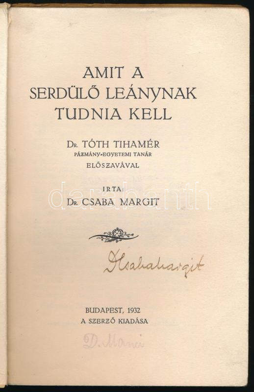 Csaba Margit: Amit a serdülő leánynak tudni kell. A szerző által ALÁÍR... https://www.darabanth.com/en/457-Online-auction/457.0/Books/Books-Other-rarities~1500037/Csaba-Margit-Amit-a-serdulo-leanynak-tudni-kell-A-szerzo-altal-ALAIRT-peldany-Toth-Tiha~II3033818
