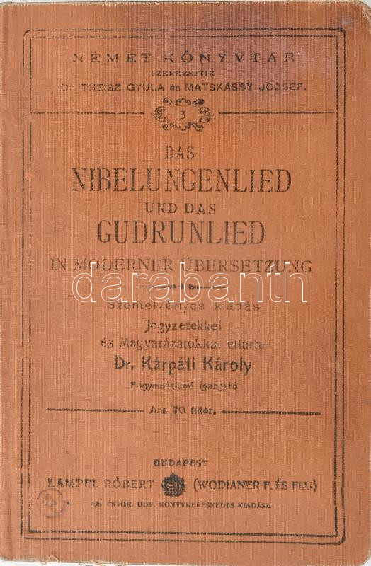 Description: Das Nibelungenlied und das Gudrunlied in moderner Übersetzung. Szemelvényes kiadás. Jegyzetekkel és magyarázatokkal ellátta: Dr. Kárpáti Károly. Német Könyvtár 4. Bp., 1902., Lampel R. (Wodianer F. és Fiai) Rt.,XIII+3+84 p. Magyar és német nyelven. Kiadói egészvászon-kötés, kissé kopott borítóval.