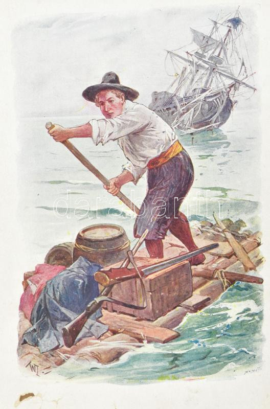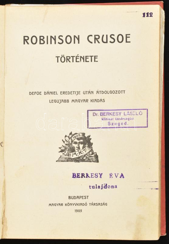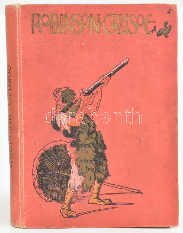 Defoe, Daniel: Robinson Crusoe története. - - eredetije után átdolgozott legujabb magyar kiadás. Bp., 1905, Magyar Könyvkiadó Társaság, 173+(3) p. + 3 (színes) t. Szövegközi és egészoldalas illusztrációkkal. Kiadói aranyozott, festett egészvászon-kötés, a borítón némi kopással, helyenként kissé foltos lapokkal, egy sérült, kijáró képtáblával, ajándékozási bejegyzéssel, tulajdonosi bélyegzőkkel.
