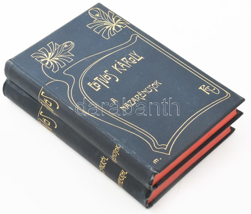 Eötvös Károly 2 műve: A nazarénusok.; Nagyokról és kicsinyekről. Eötvös Károly Munkái IX. és XIX. köt. Bp., 1904-1906, Révai. Kiadói aranyozott, szecessziós egészvászon sorozatkötés, festett lapélekkel, helyenként foltos lapokkal, egyébként jó állapotban.
