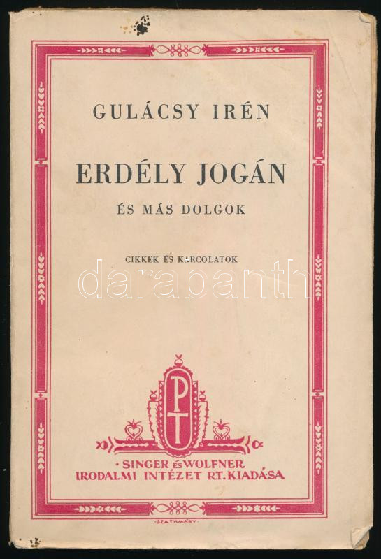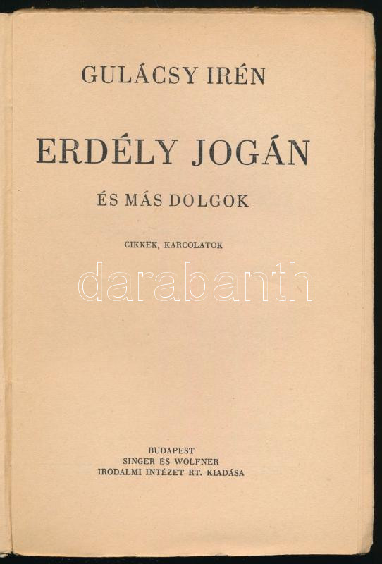 Gulácsy Irén: Erdély jogán és más dolgok. Cikkek és karcolatok. Bp., [... https://www.darabanth.com/en/457-Online-auction/457.0/Books/Books-Other-rarities~1500037/Gulacsy-Iren-Erdely-jogan-es-mas-dolgok-Cikkek-es-karcolatok-Bp-1940-Singer-es-Wolfn~II3032356