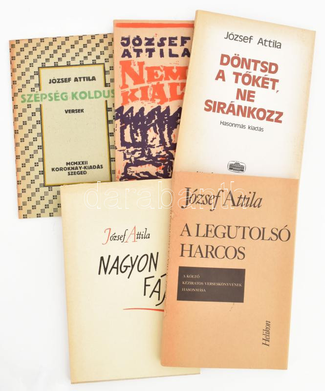 József Attila gyűjtemény, 5 db hasonmás, vagy reprint kötet: József Attila: Szépség koldusa. Versek. Szeged,1980, Somogyi-könyvtár. Reprint kiadás. Benne József Attilának Móra Ferencnek szóló nyomtatott dedikációjával. Kiadói papírkötés. Megjelent 3000 példányban. + József Attila: Nem én kiáltok. Szeged, 1985, Somogyi Könyvtár. Az 1925-ös, Koroknay kiadás reprintje. Megjelent 3000 példányban. Kiadói papírkötés, kiadói papír védőborítóban. Jó állapotban. + József Attila: Döntsd a tőkét, ne siránkozz. Reprint kiadás. Szabolcsi Miklós, Tasi József: Egy verseskönyv születése. Tanulmány. Bp., 1980, Akadémiai Kiadó. Kiadói papírkötés, kiadói papírmappában. + József Attila: Nagyon fáj. Bp., 1989, Cserépfalvi. Reprint kiadás. Kiadói papírkötés, kiadói papír védőborítóval. + József Attila: A legutolsó harcos. A költő kéziratos verseskönyvének hasonmása. Dr. Tóth Ferenc: József Attila. A legutolsó harcos c. versesgyűjteményéről. Bp., 1989, Helikon. Kiadói egészvászon-kötés, és kiadói papírkötés, kiadói kartontokban,.