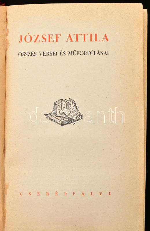 Description: József Attila összes versei és műfordításai. Sajtó alá rendezte: Bálint György. Pérely Imre rajzaival. Bp., én. (cca 1940), Cserépfalvi, 544 p. Kiadói aranyozott egészvászon-kötés, kopott borítóval, laza, sérült kötéssel, kissé sérült gerinccel.