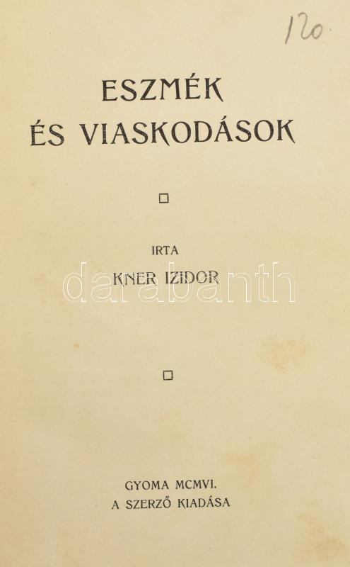 https://www.darabanth.com/en/457-Online-auction/457.0/Books/Books-Other-rarities~1500037/Kner-Izidor-Eszmek-es-viaskodasok-Gyoma-1906-Kner-Izidor-8plus408-p-Kiadoi-szecesszios-aran~II3039141