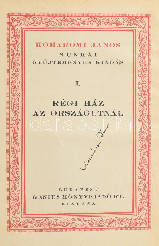 Description: Komáromi János: Régi ház az országútnál. A szerző által ALÁÍRT példány! Komáromi János munkái gyűjteményes kiadás I. köt. Bp., én., Genius. Kiadói aranyozott egészvászon-kötés, kopott borítóval, kijáró címlappal.