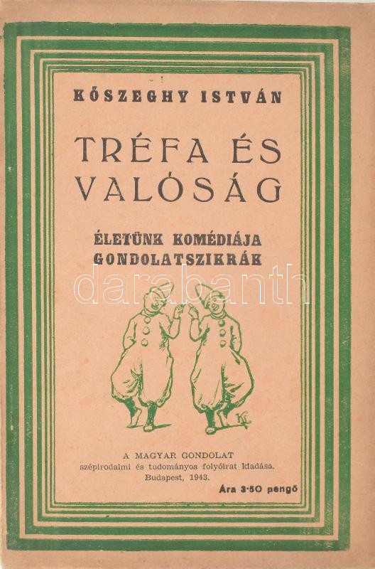 Kőszeghy István: Tréfa és valóság. Életünk komédiája tréfás versekben. Gondolatszatírák aranymondásokban. Bp., 1943, Magyar Gondolat, 60+(4) p. Kiadói papírkötés.