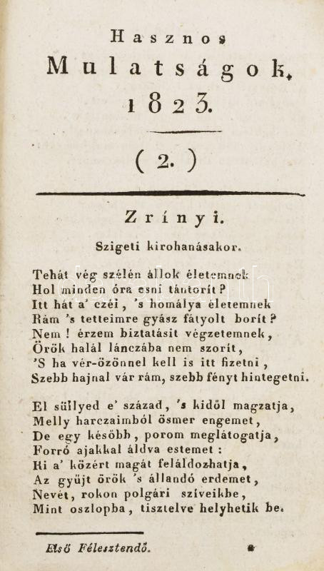 Kultsár István: Hasznos mulatságok. A' hazai 's külföldi tudósításokhoz. Toldalékúl írta 's kiadta - - . 1823. Első félesztendő. Pesten, 1823, Trattner-ny., 416+(8) p. Kiadói papírkötés, kissé viseltes, sérült, foltos borítóval, helyenként kissé foltos lapokkal, a címlapon tulajdonosi bélyegzőkkel.