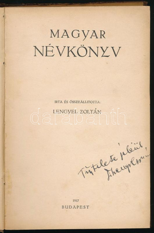 Lengyel Zoltán: Magyar névkönyv. Írta és összeállította: - -. A szerző... https://www.darabanth.com/en/457-Online-auction/457.0/Books/Books-Other-rarities~1500037/Lengyel-Zoltan-Magyar-nevkonyv-Irta-es-osszeallitotta--A-szerzo-altal-DEDIKALT-pe~II3014835