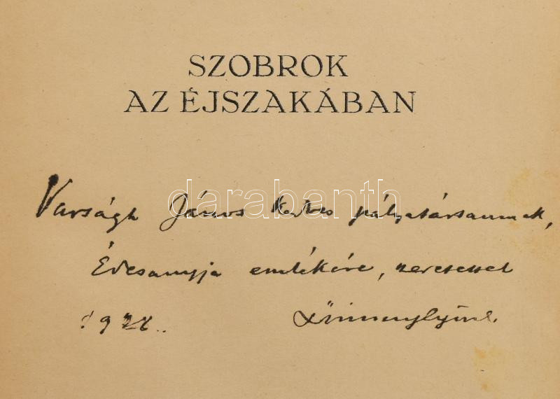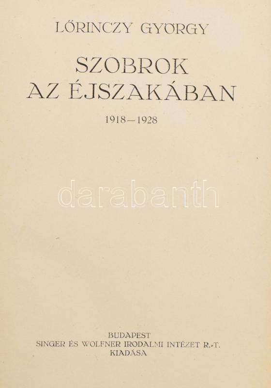 Lőrinczy György: Szobrok az éjszakában. 1918-1928. (DEDIKÁLT). Bp., [1... https://www.darabanth.com/en/457-Online-auction/457.0/Books/Books-Other-rarities~1500037/Lorinczy-Gyorgy-Szobrok-az-ejszakaban-1918-1928-DEDIKALT-Bp-1928-Singer-es-Wolfner-~II3059421