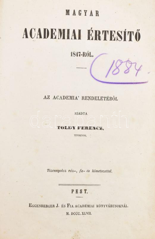 Az Academia' rendeletéből ki... https://www.darabanth.com/en/457-Online-auction/457.0/Books/Books-Other-rarities~1500037/Magyar-Academiai-Ertesito-1847-rol-Az-Academia-rendeletebol-kiadta-Toldy-Ferencz-VII-ev~II3033528