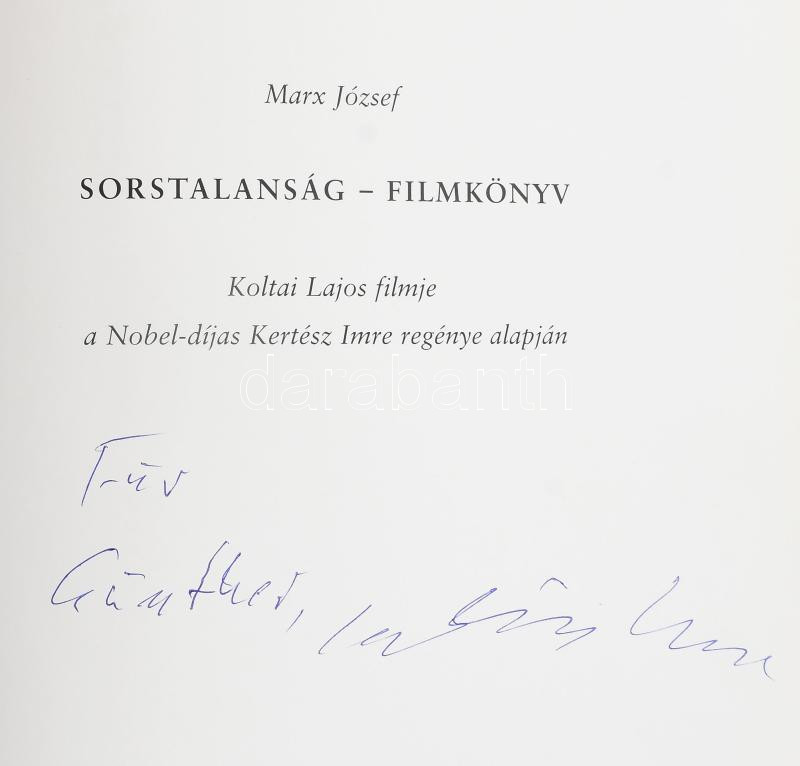 Marx József: Sorstalanság - filmkönyv. Koltai Lajos filmje a Nobel-díj... https://www.darabanth.com/en/457-Online-auction/457.0/Books/Books-Other-rarities~1500037/Marx-Jozsef-Sorstalansag-filmkonyv-Koltai-Lajos-filmje-a-Nobel-dijas-Kertesz-Imre-regenye-~II3061798