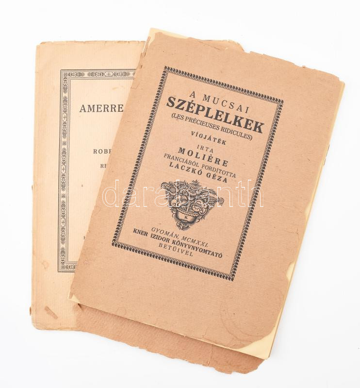 Moliére: A mucsai széplelkek. (Les précieuses ridicules. Ford.: Laczkó Géza. Monumenta Literarum I. sor. 8. sz. Gyoma, 1921., Kner Izidor. Kiadói papírkötés, sérült, viseltes hiányos borítókkal, a borító levált a füzetről, de belül jó állapotban, felvágatlan lapokkal. + Robert Browning: Amerre Pippa jár. Ford.: Reichard Piroska. Monumenta Literarum II. sor. 12. szám. Gyoma, 1922, Kner Izidor. Kiadói papírkötés, sérült borítóval.