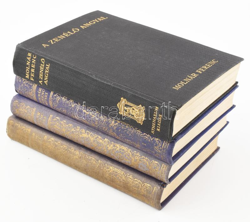 Description: Molnár Ferenc műveinek 3 kötete: Hétágú síp, Pesti erkölcsök.; Muzsika, Egy gazdátlan csónak története.; Az éhes város.; Bp., én., Franklin. Kiadói egészvászon-kötés, kopott borítóval. + Molnár Ferenc: A zenélő angyal. Egy fiatal szerelem története. Bp.,1933,Athenaeum. Kiadói aranyozott egészvászon-kötés.