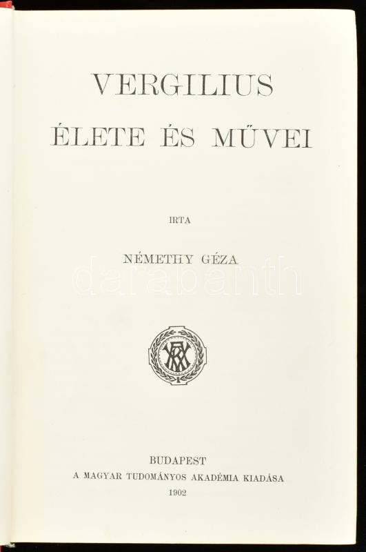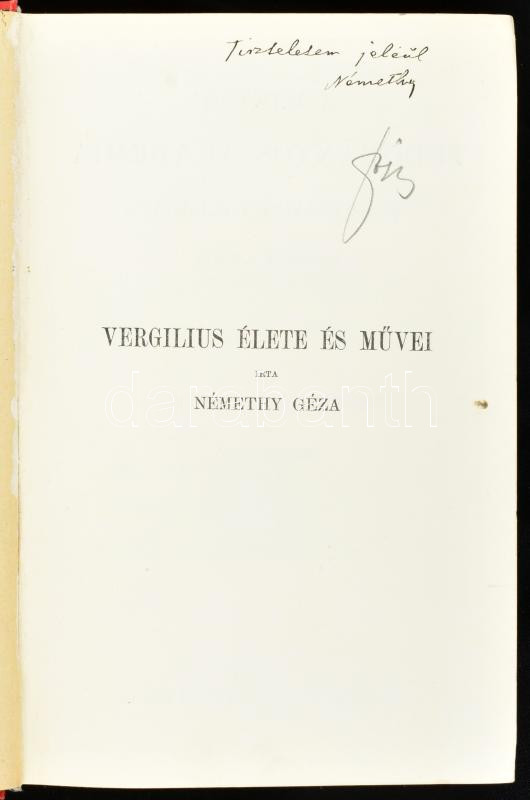 Némethy Géza: Vergilius élete és művei. A szerző, Némethy Géza (1865-1937) klasszika-filológus, irodalomtörténész, műfordító, költő által DEDIKÁLT példány! Bp., 1902, MTA, VI+2+472 p. Kiadói egészvászon-kötés, márványozott lapélekkel, foltos gerinccel és kissé foltos borítóval, a gerincen kis lyukkal, kissé laza fűzéssel.