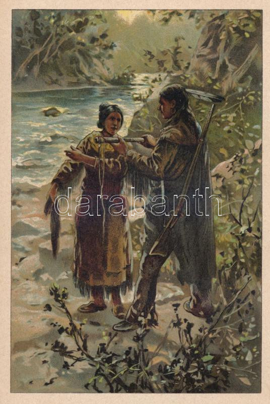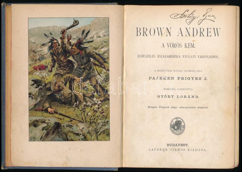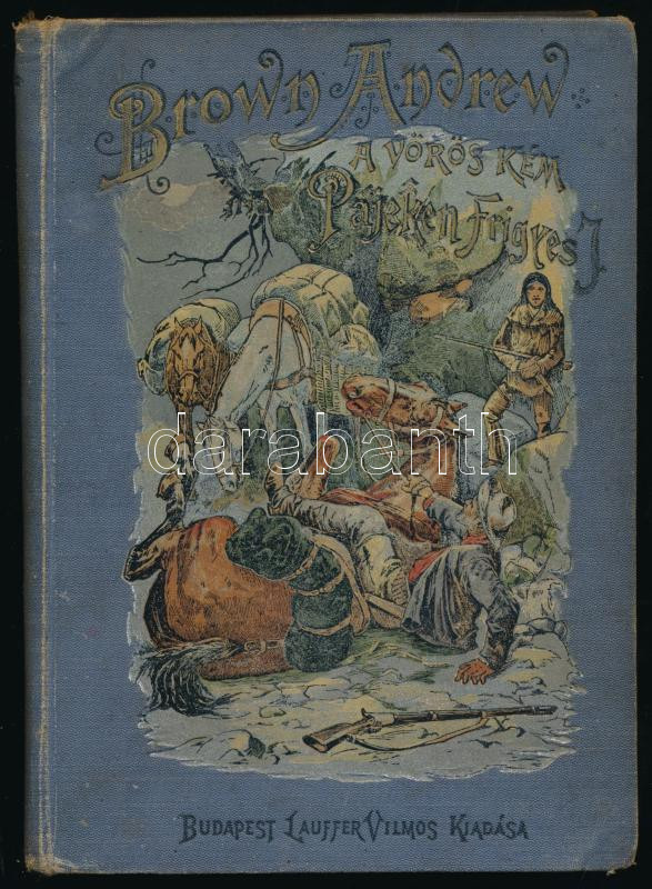 [Pajeken, Friedrich Joachim (1855-1920)] Pajeken J. Frigyes: Brown Andrew, a vörös kém. Elbeszélés Északamerika nyugati vadonjaiból. A serdültebb ifjúság számára írta - -. Németből fordította: Győry Loránd. Bergen Frigyes 4 színes litografált képével illusztrált. Bp.,[1895],Lauffer Vilmos,(Nagy Sándor-ny.), 1 t.+4+146+1 p. + 3 t. Kiadói aranyozott, festett, illusztrált egészvászon-kötés, Kiss Valdemár-kötés, kopott borítóval, az elülső szennylap, és az első 3 lap, közte a címlap és egy képtábla kijár, névbejegyzéssel.