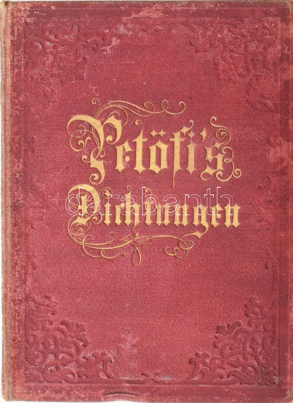 [Petőfi Sándor]: Alexander Petőfi's Dichtungen. Nach dem Ungarischen, in eignen wie fremden Uebersetzungen gesammelt von K[ároly] M[ária] Kertbeny. Berlin, 1860, A. Hofmann & Comp., XIV+138 p. Német nyelven. Korabeli aranyozott, dombornyomott egészvászon-kötésben, kopott borítóval, helyenként kissé foltos lapokkal, a belső kötéstáblák és a szennylapok koszosak.