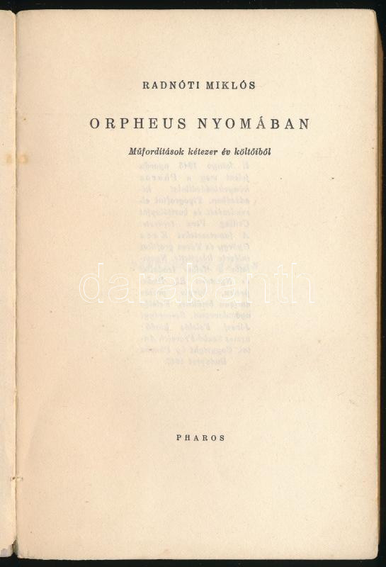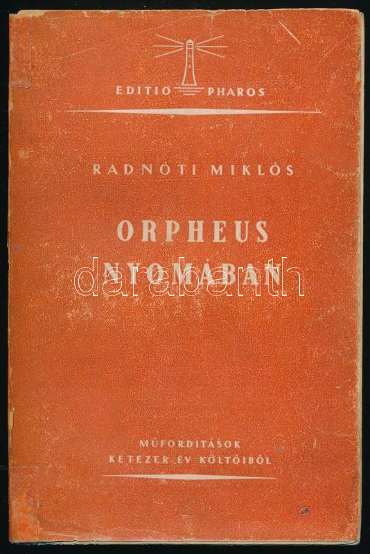 Radnóti Miklós: Orpheus nyomában. Műfordítások kétezer év költőiből. A fametszeteket Kaza György és Társa grafikai intézet készítette, a tipográfia és a borító Csillag Vera munkája. Bp., 1943, Pharos, 191 p. Első kiadás. Kiadói papírkötés, kiadói kissé sérült papírborítóval, javított kötéssel, előzéklap sarka kissé sérült. Korabeli a Pharos kiadó köteteit bemutató szórólappal.