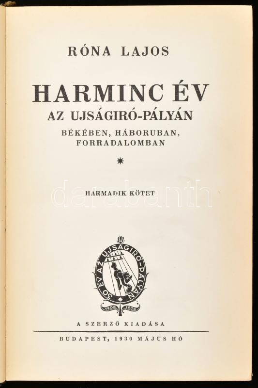 Róna Lajos: Harminc év az újságíró-pályán. Békében, háborúban, forradalomban. 1-3. köt. Bp., 1930., Szerzői,(Hungária-ny.) Kiadói félvászon-kötések, kopott, foltos borítókkal és gerincekkel, a 3. kötet gerince sérült.