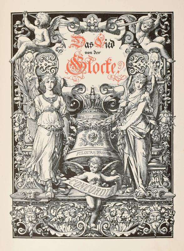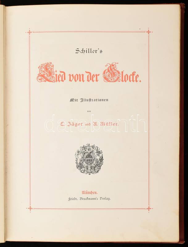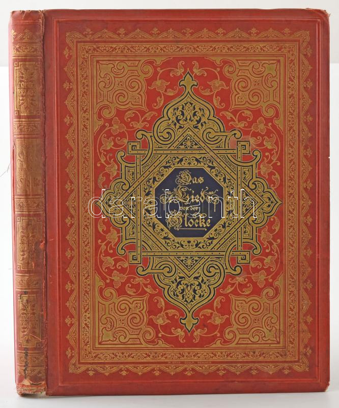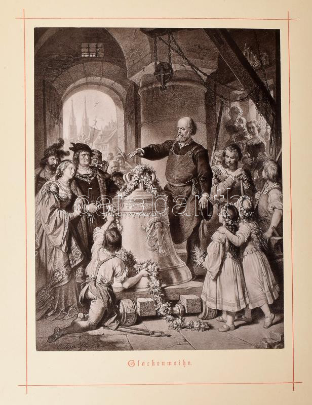 Schiller, [Friedrich]: Das Lied von der Glocke. Mit Illustrationen von C. Jäger und A. Müller. München, é.n. (cca 1880), Friedr. Bruckmann's Verlag, 3 sztl. lev.+ 22 p. + 12 (egészoldalas fénynyomatok) t. Német nyelven. Kiadói gazdagon aranyozott, festett egészvászon-kötés, aranyozott lapélekkel, kissé viseltes borÃtóval, sérült gerinccel, helyenként kissé foltos lapokkal.