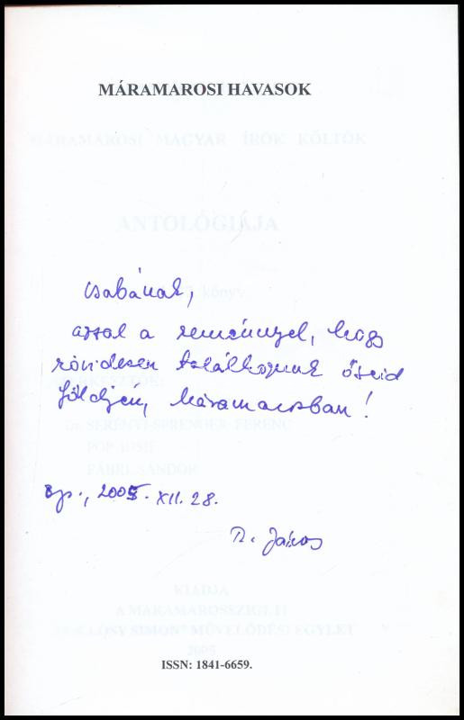 Description: Serényi-Sprenger Ferenc, Pop Iosif, Fábri Sándor (szerk.): Máramarosi havasok. Máramarosi magyar, írók költők antológiája 11./12. Máramarossziget, 2005, Máramarosszigeti "Hollósy Simon" Művelődési Egylet. Kiadói papírkötés, kissé foltos borítóval, címlapon ajándékozási sorokkal.