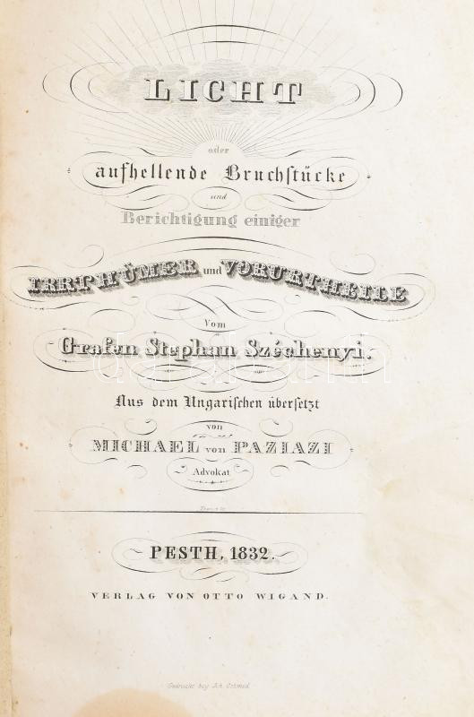 [Széchenyi István (1791-1860)] Grafen Stephan Széchenyi: Licht oder aufhellende Bruchstücke und Berichtigung einiger Irrthümer und Vorurtheile vom - - Aus dem Ungarischen übersetzt von Michael von Paziazi. Pesth, 1832., Otto Wigand, 1 (lith. díszcímlap) t.+8+XXXVI+37-224 p. Első német nyelvű kiadás. Az 1831-ben megjelent "Világ" német fordítása. Átkötött papírkötésben, foltos. Csak 224 oldal! 415 oldalban teljes! Felvágatlan lapokkal.