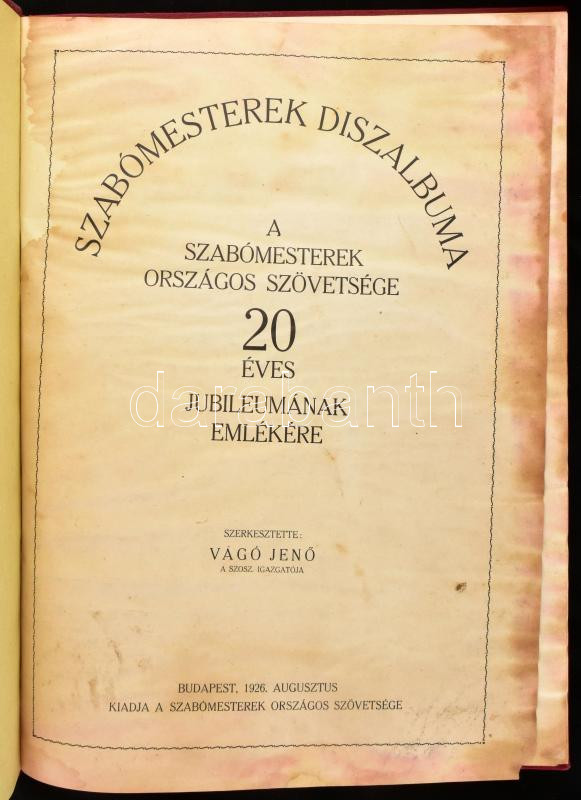 Description: Vágó Jenő (szerk.): Szabómesterek díszalbuma. A Szabómesterek Országos Szövetsége 20 éves jubileumának emlékére. Bp., 1926, Szabómesterek Országos Szövetsége. Számos képpel és reklámmal illusztrált. Modern átkötött egészvászon kötésben, az eredeti foltos és kézzel átfestett borító bekötve, erősen foltos lapokkal.