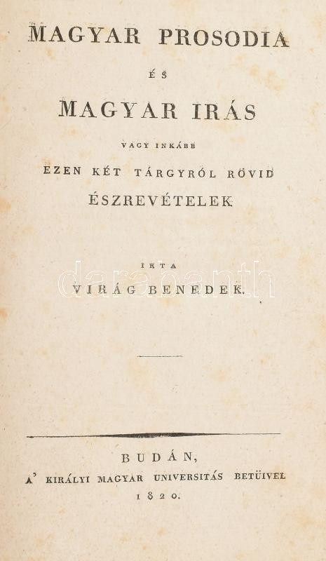 Virág Benedek: Magyar prosodia és magyar írás vagy inkább ezen két tár... https://www.darabanth.com/en/457-Online-auction/457.0/Books/Books-Other-rarities~1500037/Virag-Benedek-Magyar-prosodia-es-magyar-iras-vagy-inkabb-ezen-ket-targyrol-rovid-eszreve~II3061912