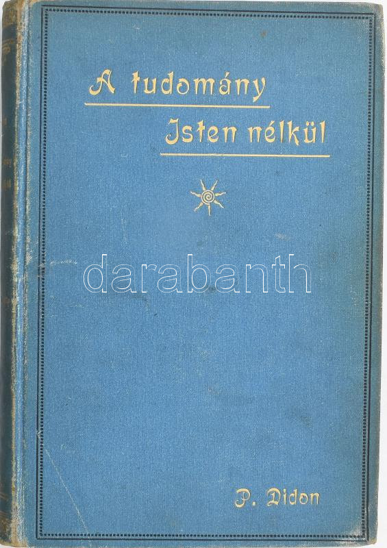 Didon, P. [Henri]: A tudomány Isten nélkül. Ford.: meggyesi Dr. Somogyi Aladár. Bp., 1897, Országgyűlési Értesítő kő- és könyvnyomdája, 3 sztl. lev.+ 277+(3) p. Kiadói aranyozott egészvászon-kötés, Gottermayer-kötés, festett lapélekkel, kopottas borítóval és gerinccel, belül jó állapotban, ceruzás bejegyzésekkel és aláhúzásokkal, régi intézményi bélyegzővel.