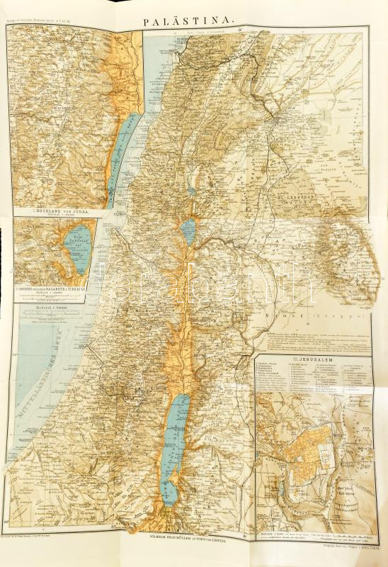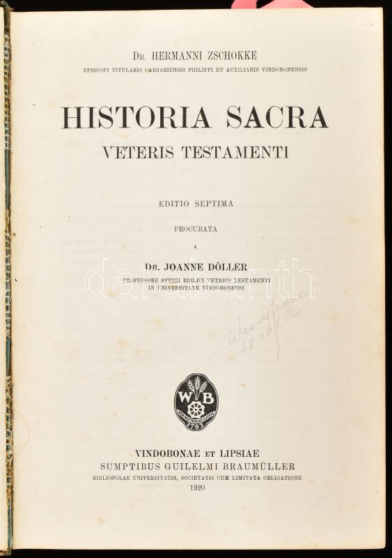 Hermanni Zschokke - Joanne Döller: Historia sacra veteris testamenti. Vindobonae et Lipsiae, 1920, Guilelmi Braumüller,XVI+586 p.+ 2 (kihajtató képtáblák, közte térkép) t. Editio septima. Latin nyelven. Korabeli félvászon-kötés, javított, pótolt gerinccel, javított kötéssel, kopott borítóval.