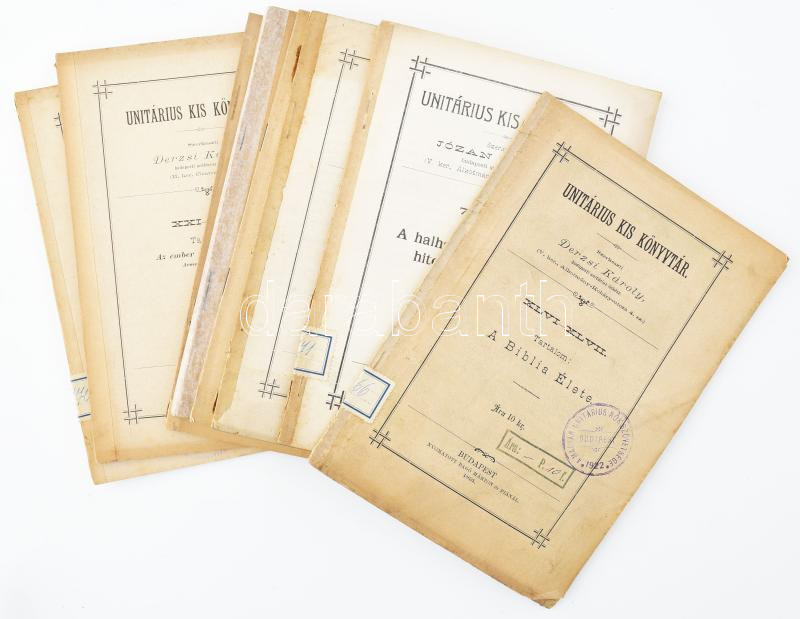 Unitárius kis könyvtár 8 kötete. Coquerel A. ifj. után: A lelkiismeret és a hit. + Armstrong A. R. után: Az ember ismerete istenről. + Dole F. K. után: Jézus és kiválóbb kortársai. + Jenkin Llyod Jones után: A világ vallásai. + Gyászima Rudolf trónörökös ő Fenségének elhunyta alkalmából + Derzsi Károly: Úrvacsorai beszédek. + A halhatatlanság helye hitelveink között. (J. E. Carpenter nyomán.) + A biblia élete. Bp., 1885-1901, klf. kiadások. Kiadói papírkötésben, változó állapotban, intézményi bélyegzőkkel.