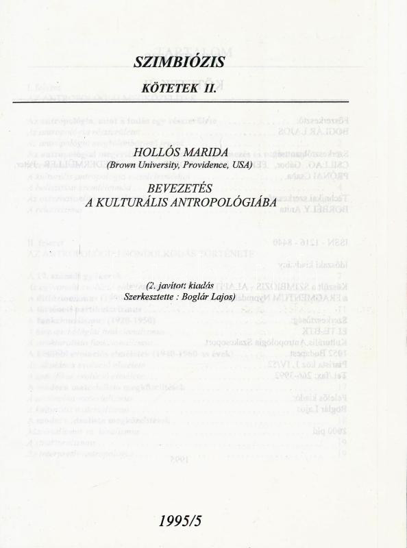 Hollós Marida: Bevezetés a kulturális antropológiába. Szimbiózis kötetek II. Bp., 1995, ELTE BTK Kulturális Antropológia Szakcsoport. 2., javÃtott kiadás. Megjelent 1000 példányban. Kiadói papÃrkötésben.