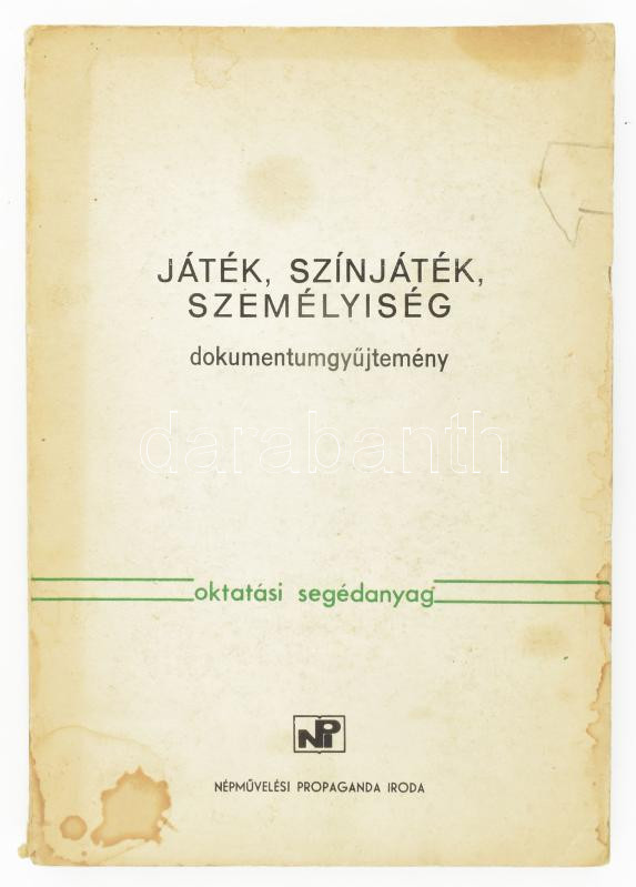Játék, színjáték, személyiség. Dokumentumgyűjtemény. Összeállította: Gabnai Katalin. (Bp., 1981), Népművelési Propaganda Iroda. Kiadói papírkötés, foltos.