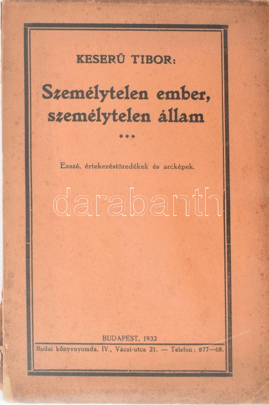 Keserű Tibor: Személytelen ember, személytelen állam. Esszé, értekezéstöredékek és arcképek. Bp., 1932, Budai könyvnyomda, 98 p. Kiadói papírkötés, sérült, kissé foltos borítóval.
