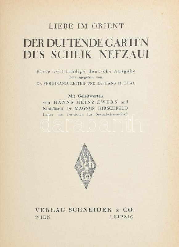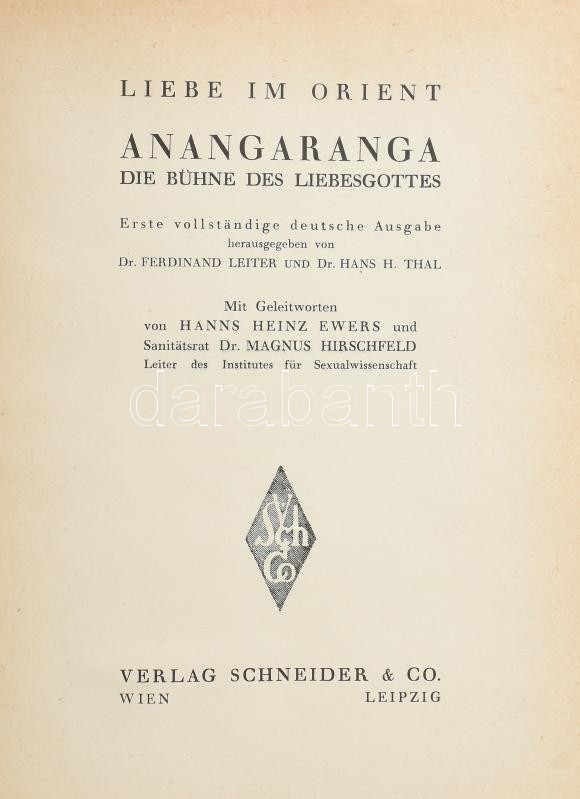 Liebe im Orient. Ügynöki mintapéldány!!! Das Kamasutram des Vatsyana. Erste vollständige deutsche Aisgabe herausgegeben von Dr. Ferdinand Leiter und Dr. Hans H. Thal. Hozzákötve: Libe im Orient. Anangaranga. Die bühne des Libesgottes. Erste vollständige deutsche Aisgabe herausgegeben von Dr. Ferdinand Leiter und Dr. Hans H. Thal. Hozzákötve: Liebe im Orient. Der Duftende Garten des Scheik Nefzaui. Erste vollständige deutsche Aisgabe herausgegeben von Dr. Ferdinand Leiter und Dr. Hans H. Thal. Wien - Leipzig,(1929),Schneider & C., VII+16+265-296 +4+16+241-256 +4+16+161-176 p. Német nyelven. Egészvászon-kötésben, a gerincen sérüléssel.