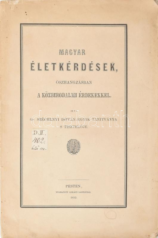 Description: [Török János]: Magyar életkérdések, öszhangzásban a közbirodalmi érdekekkel. Irta Gr. Széchenyi István egyik tanitványa s tisztelője. Pesten, 1852, Lukács László-ny., (4)+164+(2) p. Kiadói papírkötés, kissé foltos, sérült borítóval, kissé foltos lapokkal.