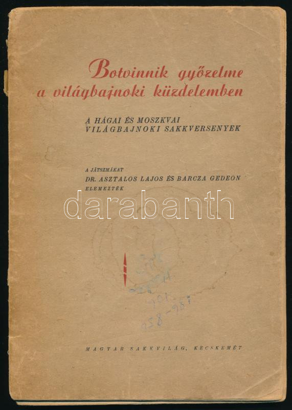Botvinnik győzelme a világbajnoki küzdelemben. A hágai és moszkvai világbajnoki sakkversenyek. A játszmákat Dr. Asztalos Lajos és Barcza Gedeon elemezték. [Kecskemét, 1949],Magyar Sakkvilág, 87+1 p. Kiadói papírkötés, foltos borítóval, sérült, szétvált gerinccel, foltos lapélekkel.