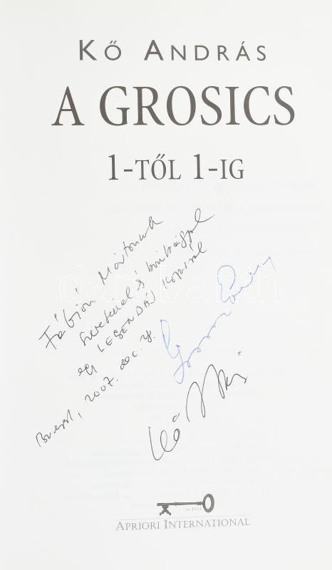 Kő András: A Grosics. 1-től 1-ig. A szerző, Kő András (1940- ) riporter, újságíró, író, illetve Grosics Gyula (1926-2014) labdarúgó, az Aranycsapat kapusa által is DEDIKÁLT példány! Bp., 2007, Apriori International. Számos fotóval illusztrálva. Kiadói kartonált papírkötés, jó állapotban.