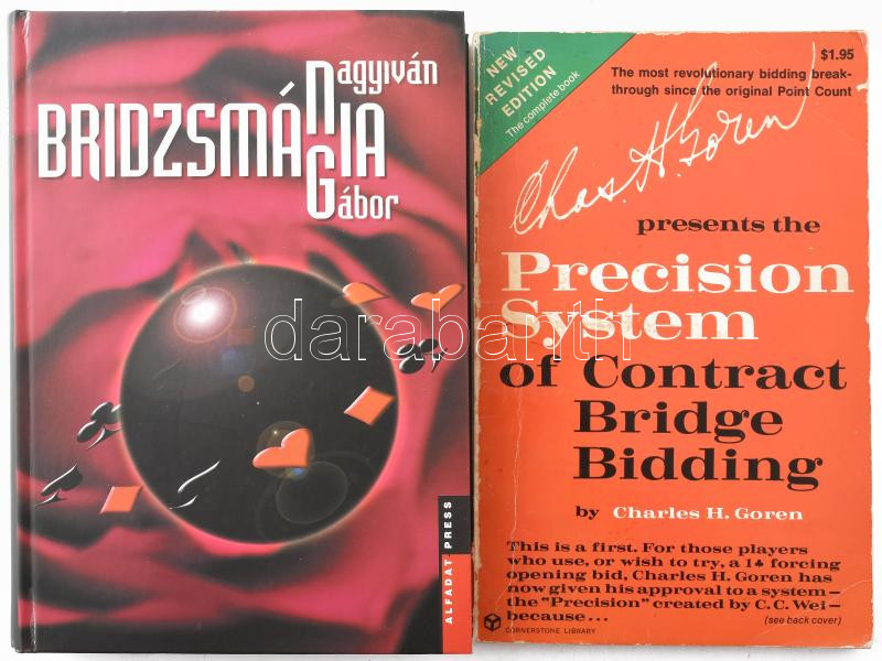 Nagyiván Gábor: Bridzsmánia. hn.,2004, Alfadat Press. Kiadói kartonált papírkötés. + Charles H. Goren presents the Precision System of Contract Bridg Bidding. Edited by. Robert B. Ewen. New York, 1974, Chancellor Hall LTD. Angol nyelven. Kiadói papírkötés, kopott borítóval, címlap sarkán hiánnyal.