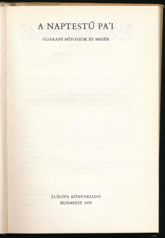 A naptestű Pa'i. Guaraní mítoszok és mesék. Vál. és az utószót írta: Salvador Bueno. Ford. és a jegyzeteket írta: Dorbach Mária. A könyv borító illusztrációja és az illusztrációk Lóránt Lilla munkái. Népek meséi sorozat. Bp., 1979, Európa. Kiadói félvászon-kötés, kiadói papír védőborítóban, kissé foltos felső lapélekkel, jó állapotban.