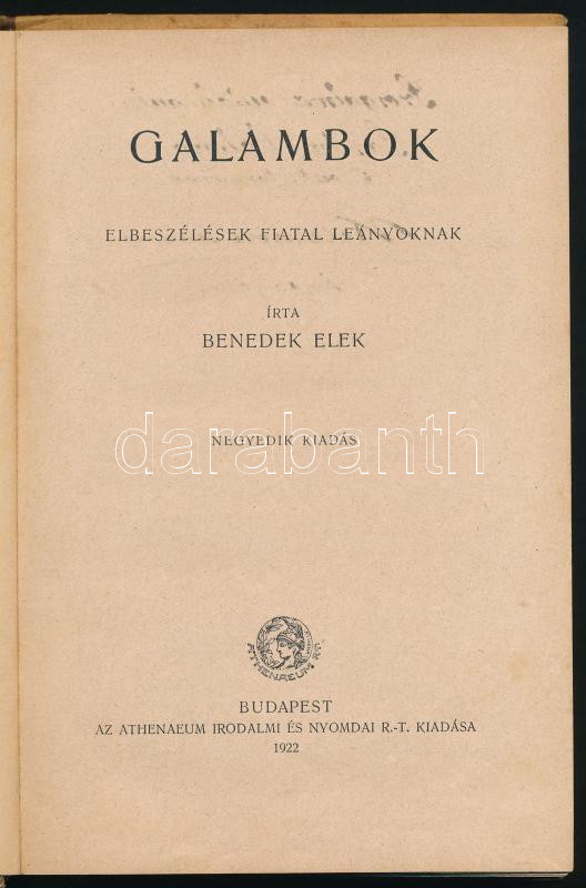 Benedek Elek: Galambok. Elbeszélések fiatal leányoknak. Bp., 1922, Ath... https://www.darabanth.com/en/457-Online-auction/457.0/Books/Books-Tales~1500035/Benedek-Elek-Galambok-Elbeszelesek-fiatal-leanyoknak-Bp-1922-Athenaeum-121plus1-p-Negyedik~II3009560