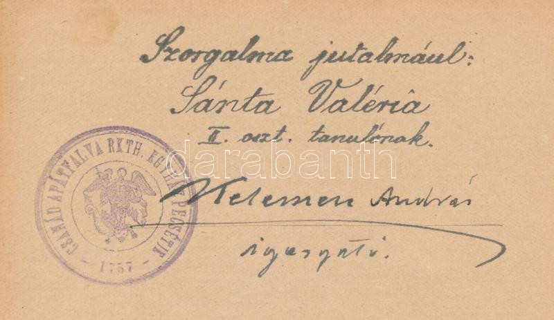 Description: Benedek Elek: Galambok. Elbeszélések fiatal leányoknak. Bp., 1922, Athenaeum, 121+(1) p. Negyedik kiadás. Kiadói félvászon-kötés, kissé foltos borítóval, helyenként kissé foltos lapokkal, ajándékozási bejegyzéssel, "Csanád Apátfalva rkth. egyház pecsétje" bélyegzővel.