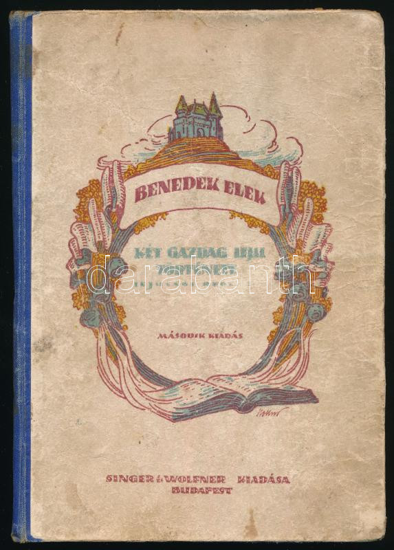 Description: Benedek Elek: Két gazdag ifju története. Mühlbeck Károly rajzaival. Bp., é.n. (cca 1910), Singer és Wolfner, 135+(1) p. Második kiadás. Kiadói félvászon-kötés, kopott, foltos borítóval, javított címlappal, lapszéli ázásnyomokkal.