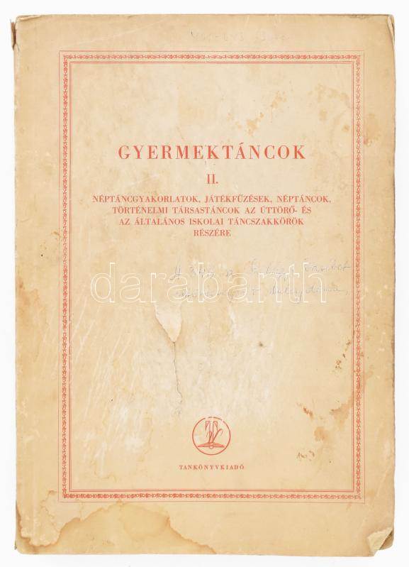 Gyermektáncok II. Néptáncgyakorlatok, játékfűzések, néptáncok, történelmi társastáncok az úttörő- és az általános iskolai táncszakkörök részére. Szerk.: Sz. Szentpál Mária. Bp., 1961, Tankönyvkiadó, 354+(2) p. Kiadói papírkötés, erősebben sérült, foltos borítóval, a címlapon kisebb szakadással, helyenként lapszéli foltokkal. Megjelent 2500 példányban.
